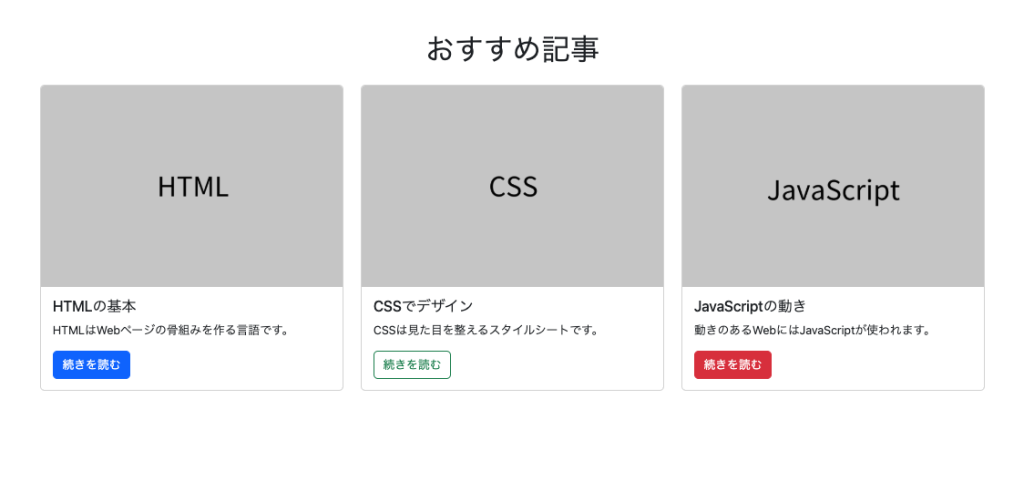 Bootstrapでは、画像・見出し・本文・ボタンなどを1つのまとまりで表示する「カードレイアウト」がよく使われます。ニュース記事一覧や商品一覧、ブログ記事のサマリーなどで活用されます。