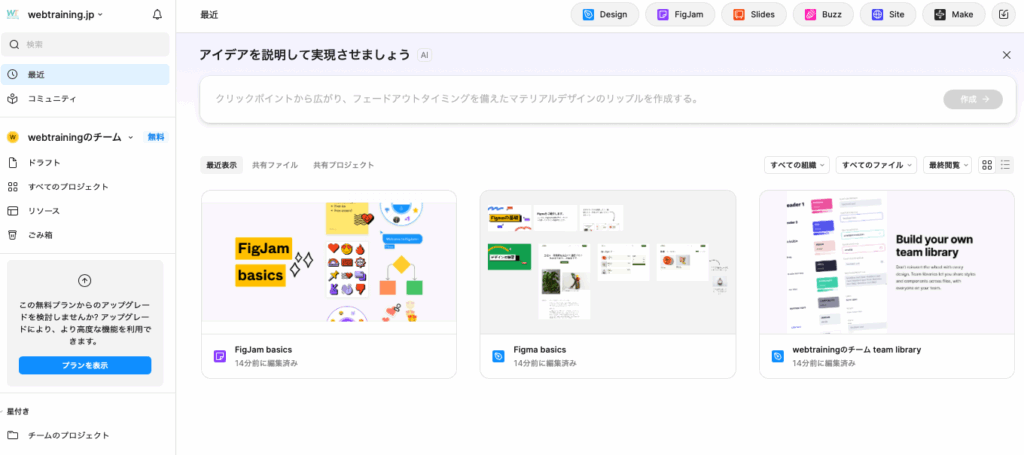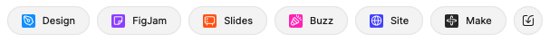 画面右上にある Design(デザインファイル)FigJam(ホワイトボード・付箋などの共同作業に使う) Sliders(テンプレートなど)・・・などが作成する内容によって、まずはクリックするボタンです。