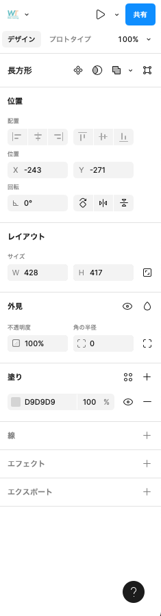 画面右側にあるのが プロパティパネル です。ここが Figma の中で最も大切なパネルで、選択した要素のすべての設定をここで変更できます。