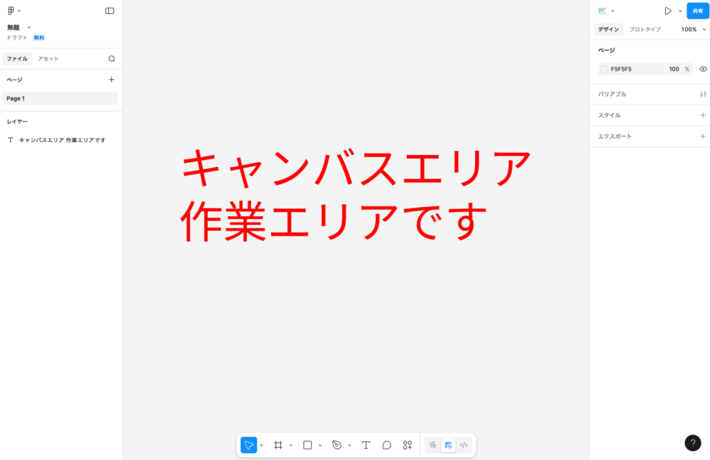 画面下部の細長いエリアが「ツールバー」です。ここにFigmaの主要ツールが並んでいます。左から