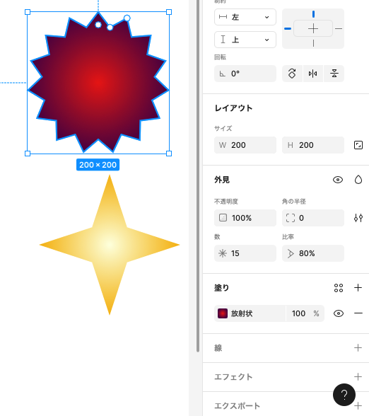 • 左側の爆弾のような図形は、塗りをグラデーション(放射状)にし、数を15個 比率を80%で作成