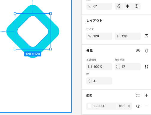 数を4とし、角の半径を25にします。そのあと、同じ図形をコピーし、大きさを120px * 120pxにし、中央に重ねるように配置します。塗りは白とし、角の半径は17に変更します。