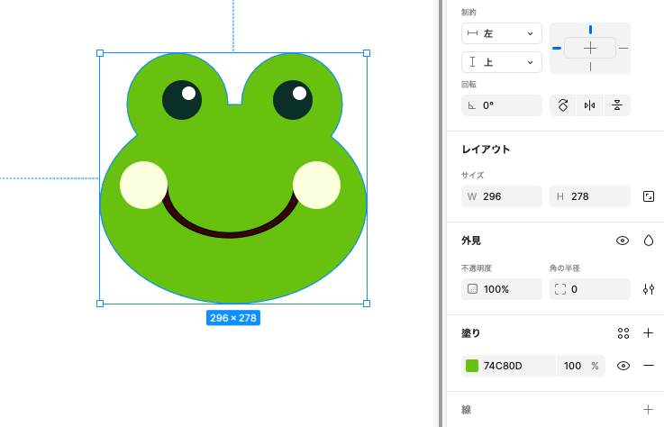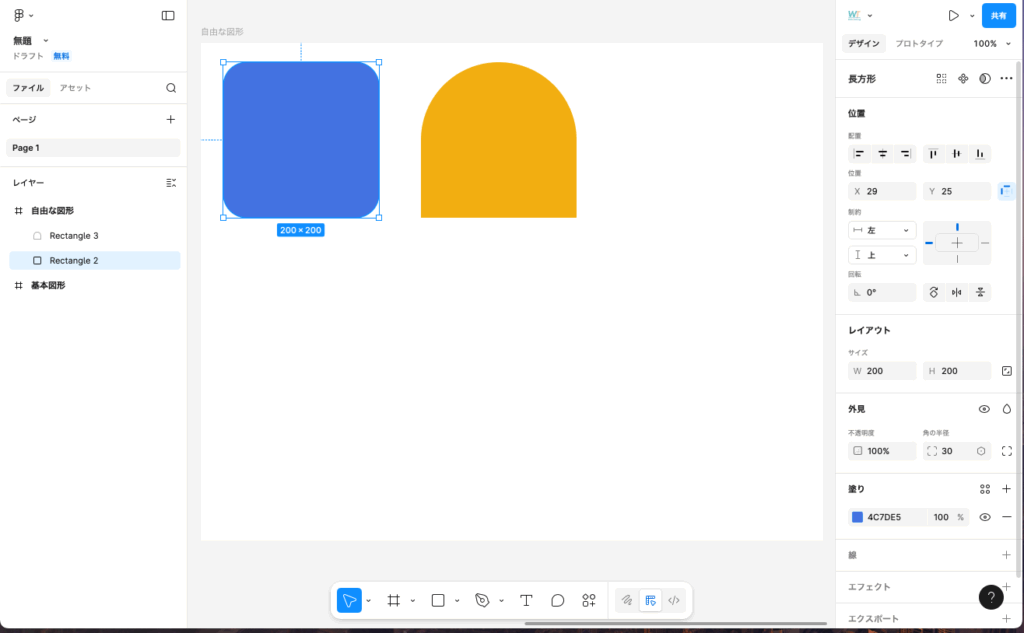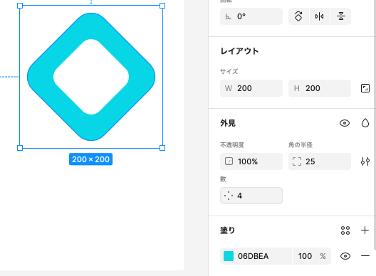 長方形ツールを使って、200px * 200pxの正方形を描いておきます。塗りは任意です。描いた長方形を選択し、右側のプロパティパネルの外見>角の半径で角を丸くする(radius)を設定できます。