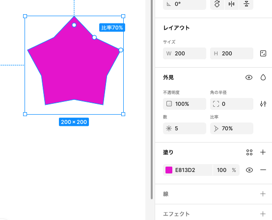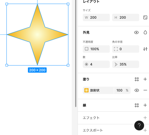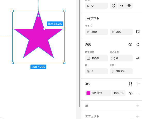 星ツールを使って、200px * 200pxの星を描いておきます。塗りは任意です。星ツールは、多角形よりも細かい設定ができます。比率を変えることで、ふっくらとした印象の星に変わります。また多角形と同様に個数も変えることができます。