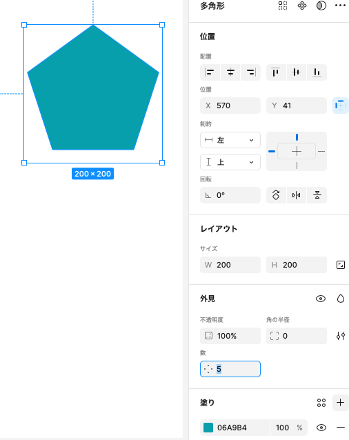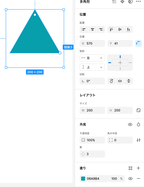 多角形ツールを使って、200px * 200pxの三角形を描いておきます。塗りは任意です。多角形ツールを使うと、三角形〜十角形以上まで自由に作れますので、外見>数から五角形に変更してみましょう。最大60角形まで可能です。