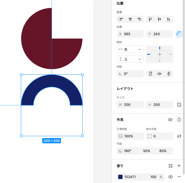 円弧の開始位置・比率・終了位置を変えてみましょう。