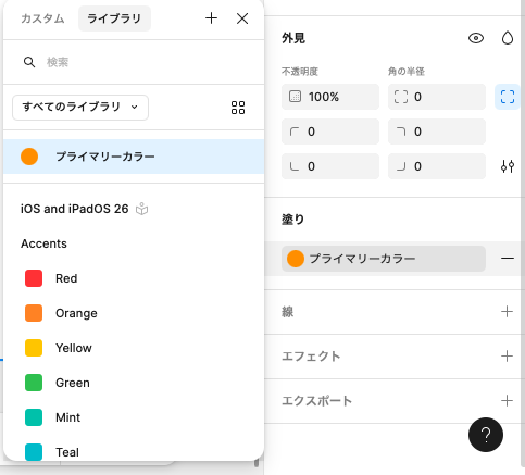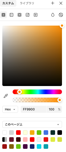Figmaは同じキャンバス内で使った色は、カラーピッカーの一番下に「このページ上」というところに格納されていきます。またデザイン上決まった色を使う場合は、、スタイルに登録 をしておくと便利です。ここではプライマリーカラーという名前をつけてライブラリに保存しています。