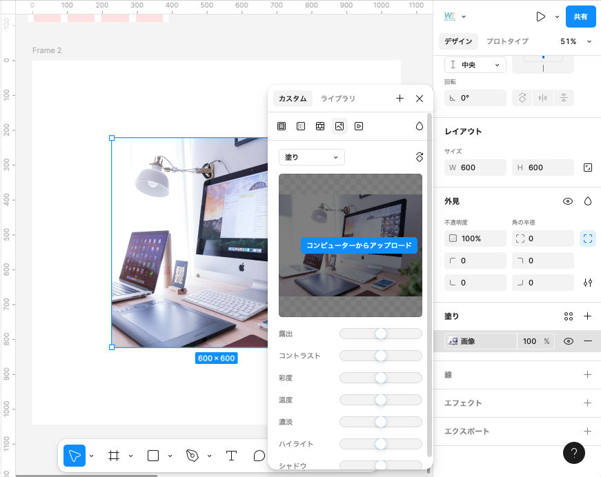 画像は、「露出」や「コントラスト」といった変更や、塗りの他にも、自動調整・トリミング・タイルといった設定が可能です。