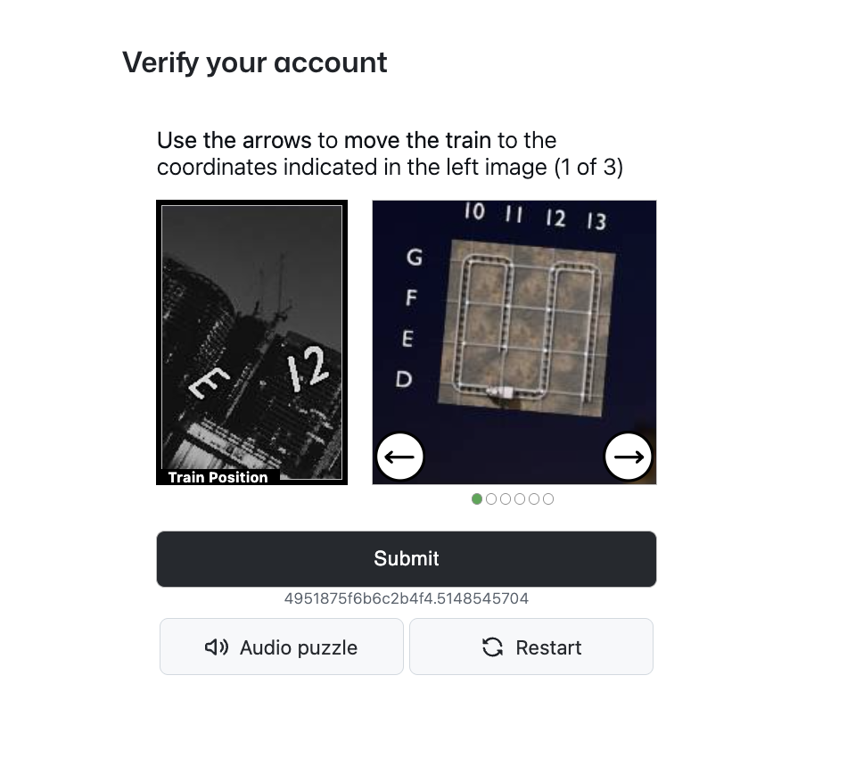 4. または、下記の様な画面の指示にしたがってパズルを操作する画面が出てきます。下記の場合、画面の左には「E, 12」と書かれた黒白の画像があり、これは 移動させるべき座標(位置) を示しています。画面の右には線路のようなマス目と左右の矢印ボタンがあり、この位置を左右に動かして指定の場所に合わせる パズルです。