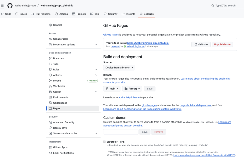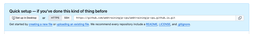 例えば今回のユーザー名が「webtrainingjp-cpu」なので、webtrainingjp-cpu.github.io と入力します。