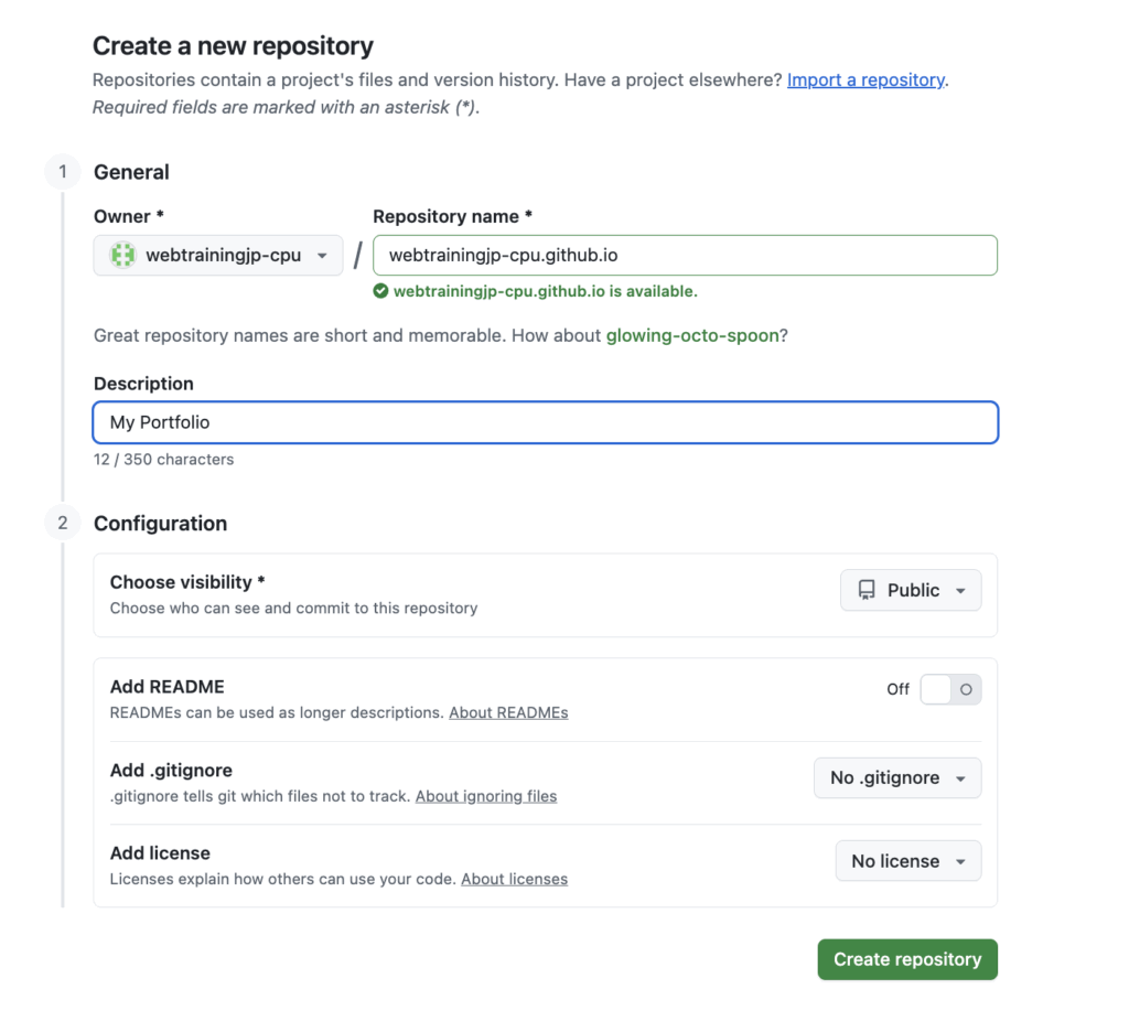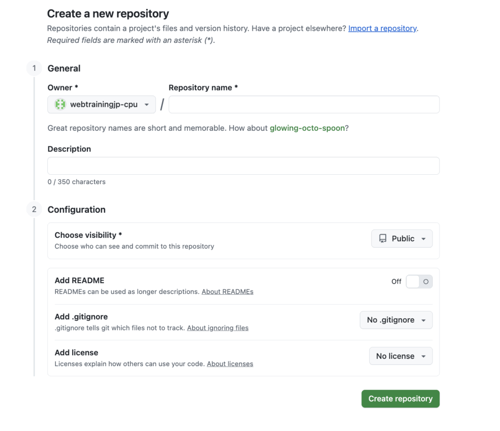 右下の 「Create repository」(緑のボタン)をクリックしてください!