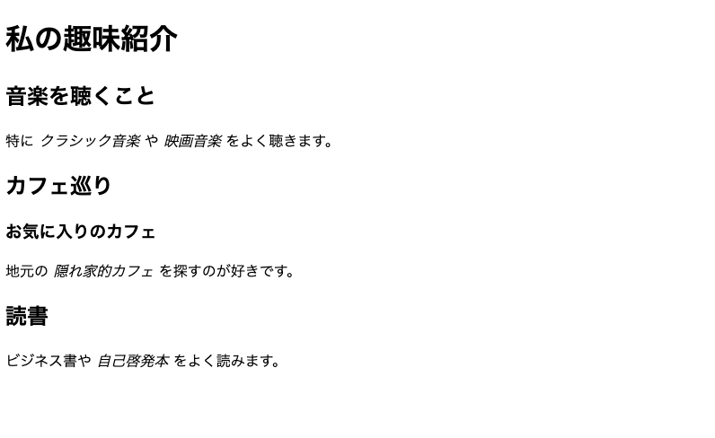 <h1>タグで全体のタイトル「私の趣味紹介」と表示すること- 以下のような構成で見出しと本文を組み立てること
