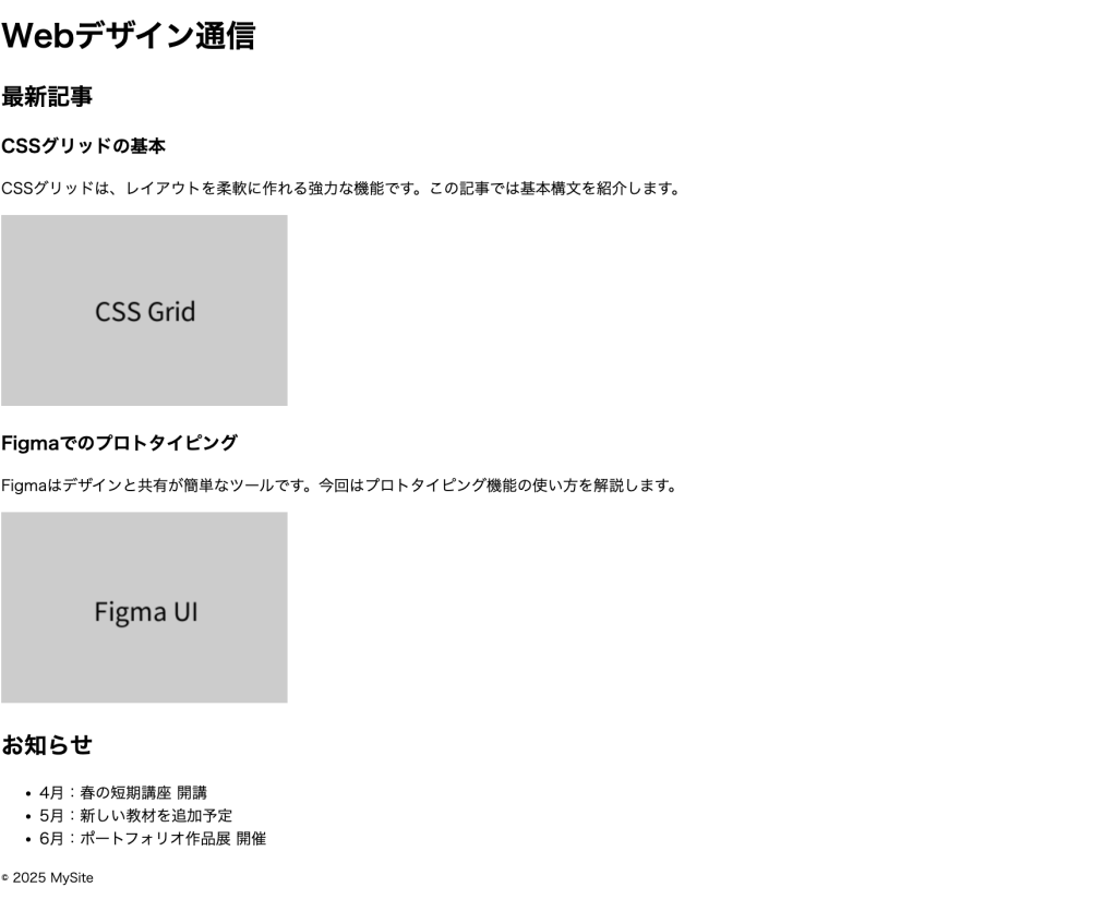 以下の構成を参考にして、セマンティックな構造を意識したニュースページ風のWebページを作成してください。