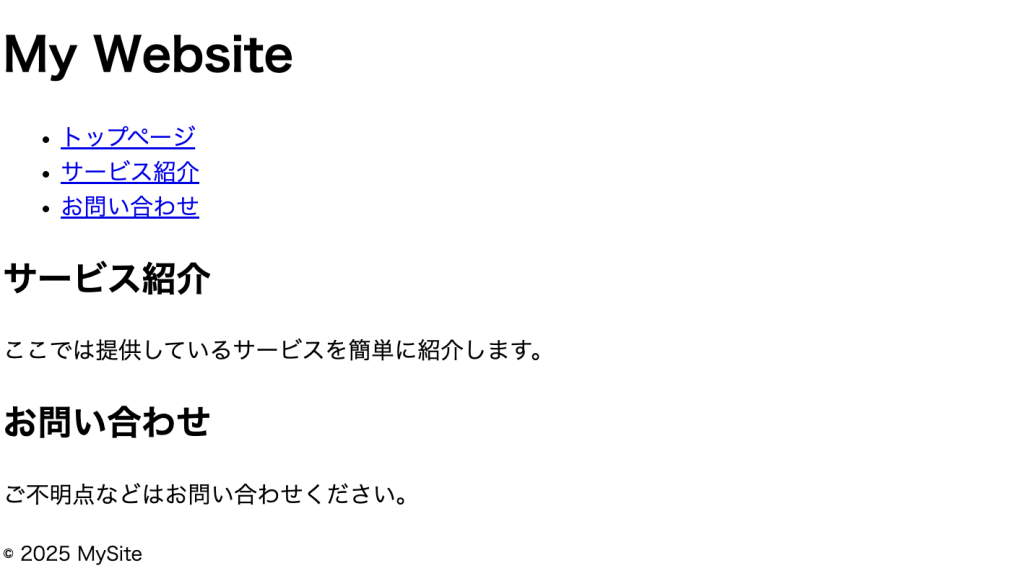 <header>の中に<nav>が正しく配置されているか<ul>・<li>でナビゲーションが構造化されているか- 各リンクがページ内の該当見出し(id指定)に対応しているか