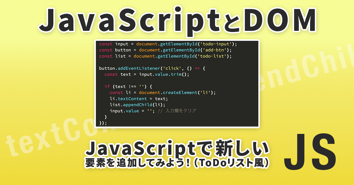 createElement() と appendChild() を使って、JavaScriptで新しいリスト項目を作って画面に追加してみましょう。