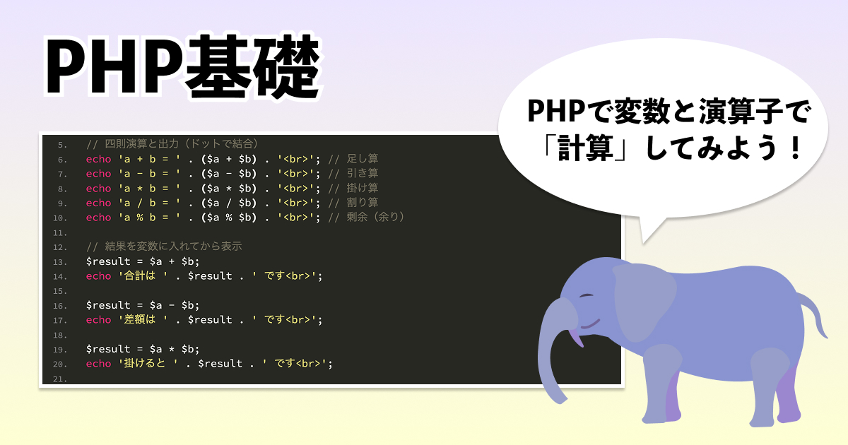 <?php $a = 10; $b = 3; // 四則演算と出力(ドットで結合) echo 'a + b = ' . ($a + $b) . '<br>'; // 足し算 echo 'a - b = ' . ($a - $b) . '<br>'; // 引き算 echo 'a * b = ' . ($a * $b) . '<br>'; // 掛け算 echo 'a / b = ' . ($a / $b) . '<br>'; // 割り算 echo 'a % b = ' . ($a % $b) . '<br>'; // 剰余(余り) // 結果を変数に入れてから表示 $result = $a + $b; echo '合計は ' . $result . ' です<br>'; $result = $a - $b; echo '差額は ' . $result . ' です<br>'; $result = $a * $b; echo '掛けると ' . $result . ' です<br>'; $result = $a / $b; echo '割ると ' . $result . ' です<br>'; $result = $a % $b; echo '余りは ' . $result . ' です<br>'; ?>