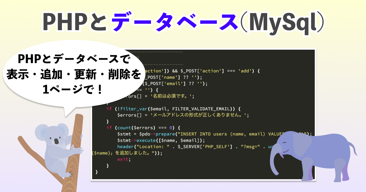 | ① 表示処理(SELECT) | まず一覧を取得して $rows に入れておくと、このあとどの処理が走っても最終的に画面に反映できます。 |