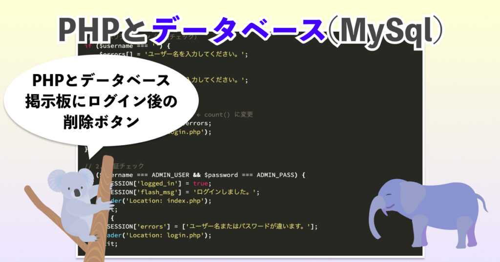 PHPとデータベース掲示板にログイン後の削除ボタン