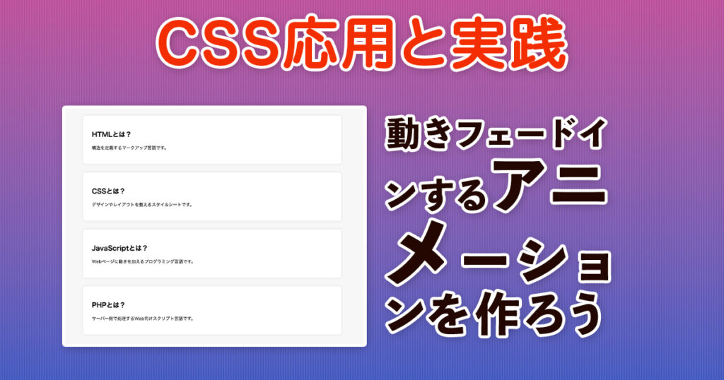 作成ファイル・保存場所 css-practice フォルダを作成し、以下のファイルを用意してください。 ファイル名内容fadein-animation.htmlアニメーション練習用のHTMLファイルfadein-animation.cssCSSアニメーション用のスタイルシートファイル HTMLはコピーし... -