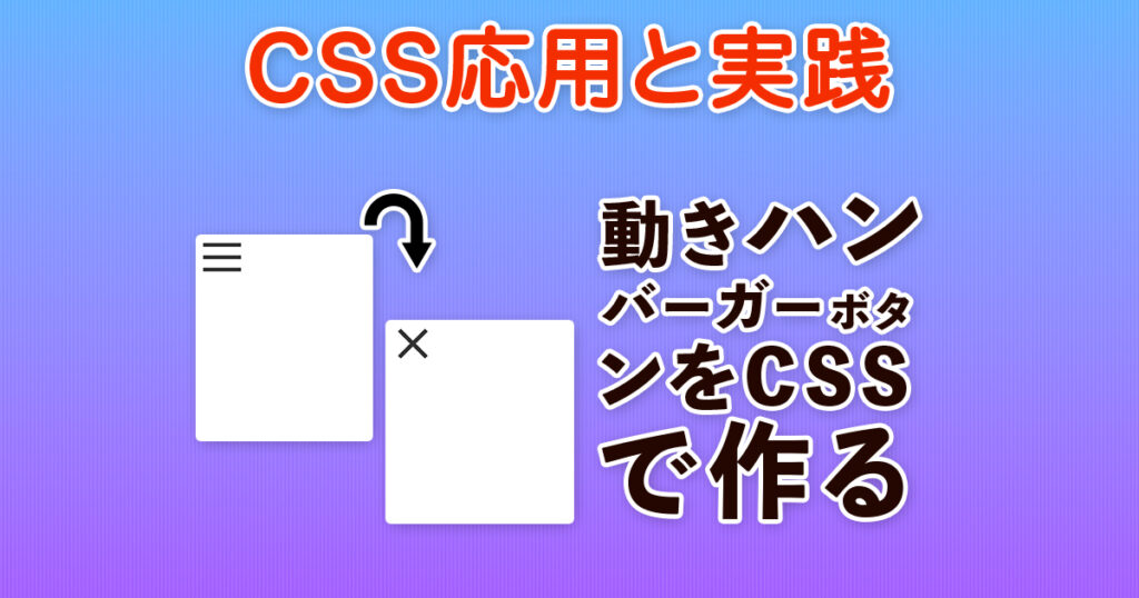 作成ファイル・保存場所 css-practice フォルダを作成し、以下のファイルを用意してください。 ファイル名内容hamburger-menu.htmlハンバーガーメニュー用のHTMLファイルhamburger-menu.cssCSSアニメーション用のスタイルシートファイル HTMLは下記からコ... -