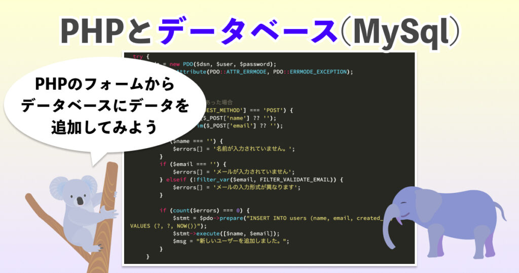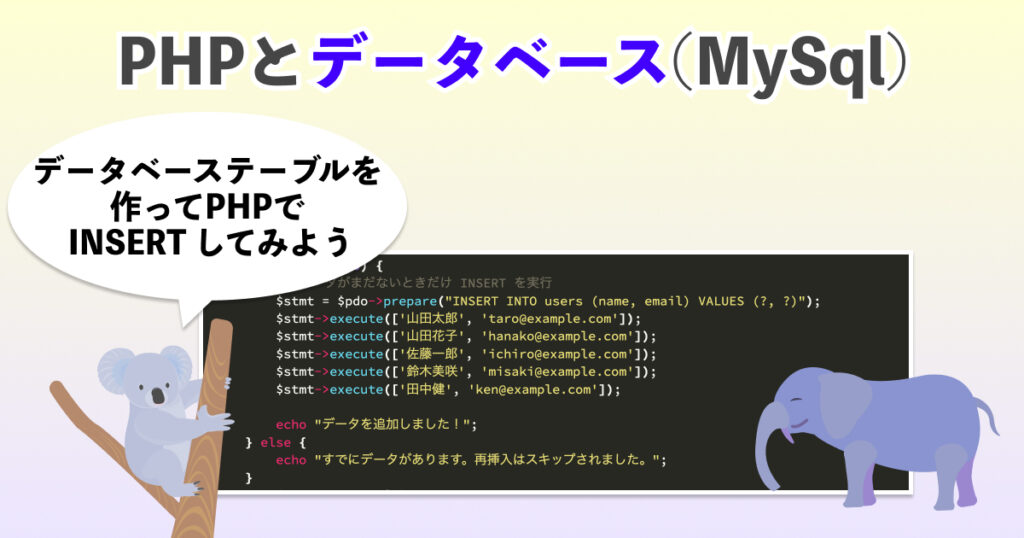 フォルダとファイル名 php-db フォルダに db02.php ファイルを作成します。ここでは、SQLでテーブルを作り、データを挿入(INSERT)する方法を学びます。 チェックポイント CREATE TABLE でテーブルを作成できたか? PDO の prepare() と execute() を使っ... -