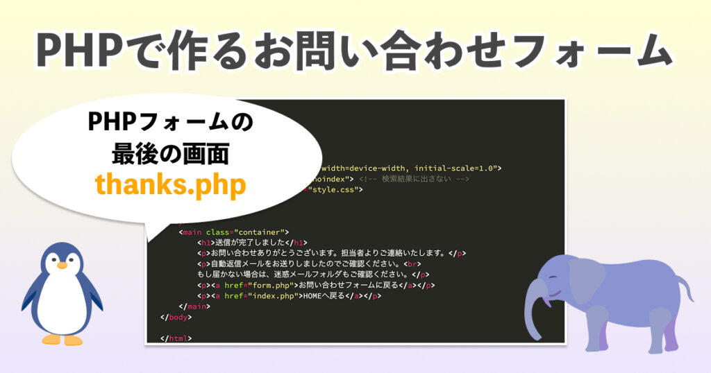 send.phpのPHPを作成後、php-contact/ フォルダの中にthanks.phpを作成します。 シンプルなHTMLのみですので、CSSなどで見た目を整えましょう。 thanks.phpの作成 <!DOCTYPE html> <html lang="ja"> <head> <meta charset="UTF-8"> <t... -